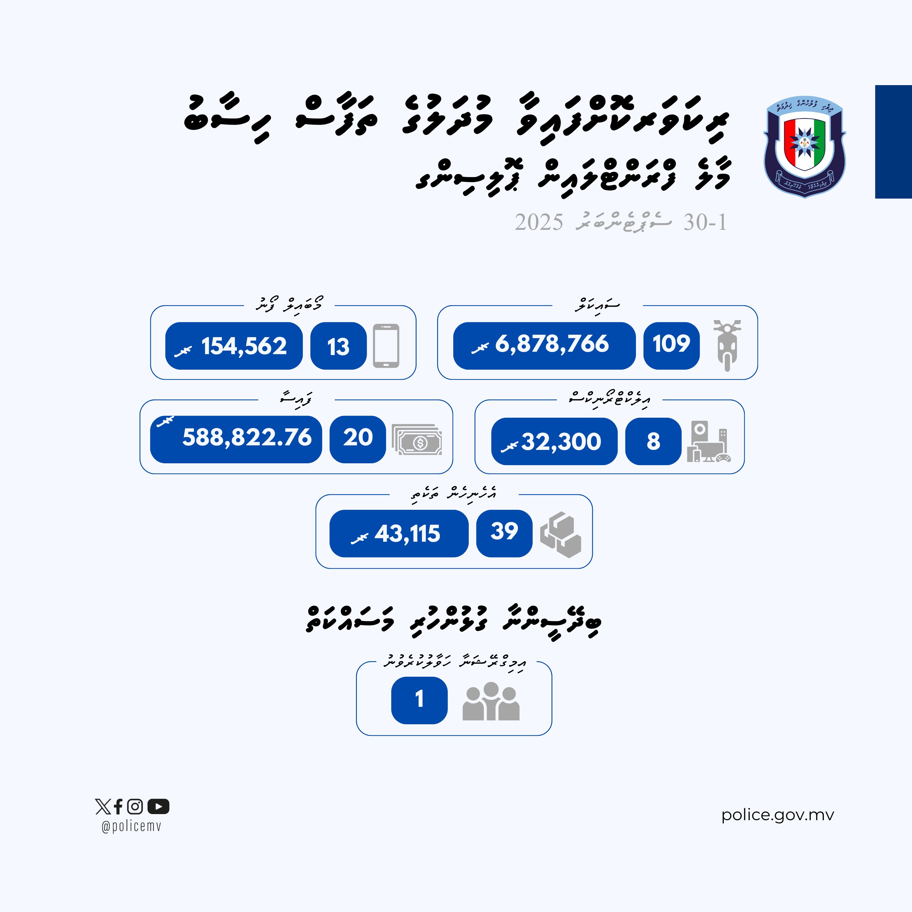 މިދިޔަ މަހު މާލޭ ސަރަޙައްދުން ފުލުހުން ރިކަވަރކޮށްދިން މުދަލުގެ އަގު 7.6 މިލިއަން ރުފިޔާއަށް އަރާކަން އެ އިދާރާއިން ހާމަކުރި ތަފާސްހިސާބުން ހާމަވެއްޖެއެވެ.