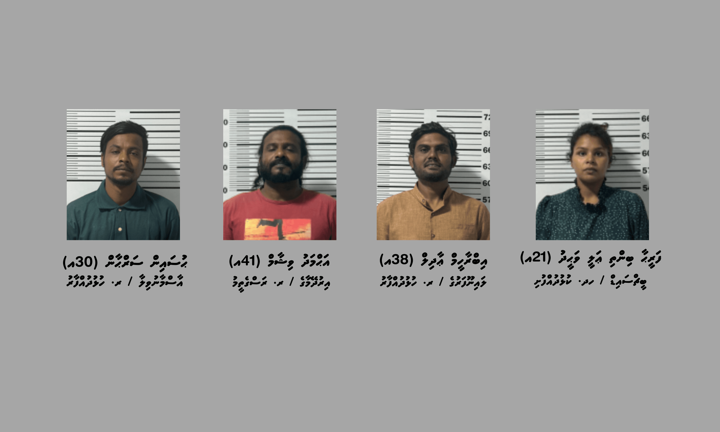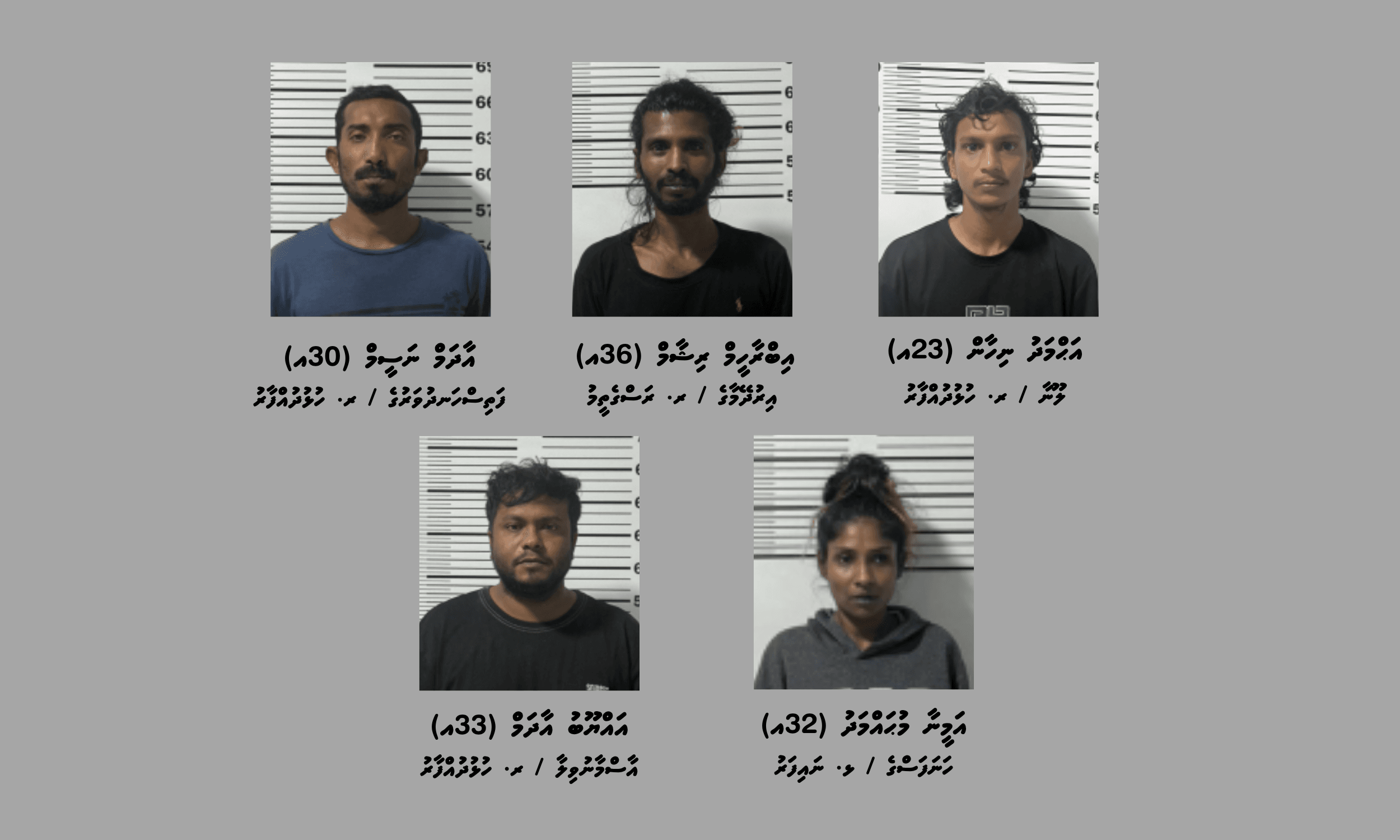 މި މައްސަލައާ ގުޅިގެން ހައްޔަރުކޮށްފައި ވަނީ، ރ. ހުޅުދުއްފާރު / ލޫނާ، އަޙްމަދު ނިހާން (23އ) އާއި، ރ. ރަސްގެތީމު / އިރުދޭމާގެ، އިބްރާހީމް ރިޝާމް (36އ) އާއި، ރ. ހުޅުދުއްފާރު / ފަތިސްހަނދުވަރުގެ، އާދަމް ނަސީމް (30އ) އާއި، ޅ. ނައިފަރު / ހަނަފަސްގެ، އަމީނާ މުޙައްމަދު (32އ) އާއި، ރ. ހުޅުދުއްފާރު / އާސްމާނުވިލާ، އައްޔޫބު އާދަމް (33އ) އާއި، ހދ. ކުޅުދުއްފުށި / ބީޗްސައިޑް، ފަރީޙާ ބިންތި ޢަލީ ވަޙީދު (21އ) އާއި، ރ. ހުޅުދުއްފާރު / ލައިނޫފަރުގެ، އިބްރާހީމް ޢާދިލް (38އ) އާއި، ރ. ރަސްގެތީމު / އިރުދޭމާގެ، އަޙްމަދު ވިޝާމް (41އ) އާއި، ރ. ހުޅުދުއްފާރު / އާސްމާނުވިލާ، ޙުސައިން ސަރްޙާން (30އ) އެވެ.