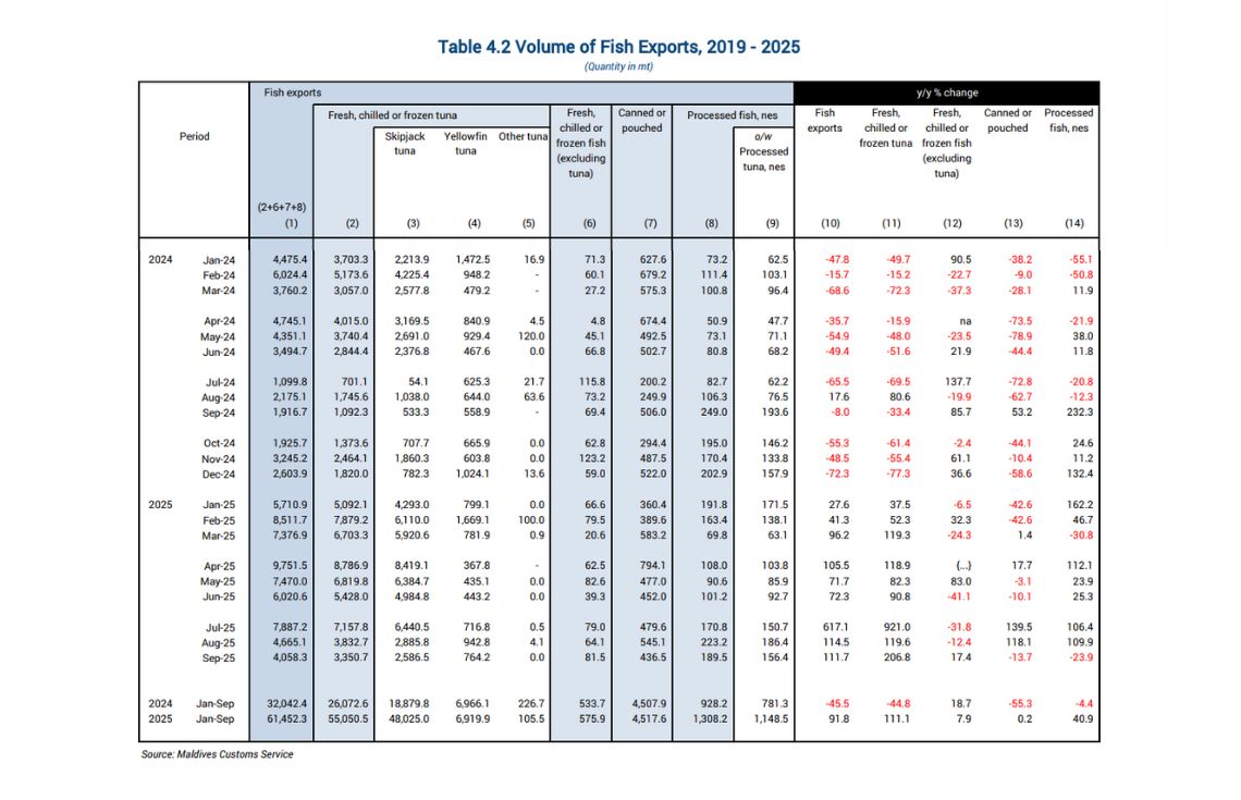 ދެންމެ މި ބަޔާންކުރި ޢަދަދުތަކަކީ ހަމައެކަނި މި އަހަރު ފެށުނުކޮޅު އައި ބަދަލުތަކެވެ. ނަމަވެސް އަހަރުގެ ފަހުކޮޅުގެ ޙިސާބުތަކަކީ އަދި މާ ޙައިރާންކުރަނިވި ޢަދަދުތަކެކެވެ. މި ގޮތުން، އިހަށް ސެޕްޓެންބަރު މަހު މި އަހަރުގެ 4 ބައި ކުޅަ 3 ބައި ވޭތުވުމާ ގުޅިގެން ސަރުކާރުން ޝާއިޢުކުރެއްވި ޙިސާބުކިތާބުން ދައްކާ ގޮތުގައި، މި އަހަރު ފެށިގެން ސެޕްޓެންބަރު މަހުގެ ނިޔަލަށް މަސް އެކްސްޕޯޓުކުރި ޖުމްލަ މިންވަރު ވަނީ 61،452.3 ޓަނަށް އުފުލިފައެވެ. މިދިޔަ އަހަރުގެ މި މުއްދަތުގައި ބޭރުކުރީ އެންމެ 32،042.4 ޓަނެވެ. ވުމާ އެކު، މި އަހަރުގެ ޢަދަދު ވަނީ 2 ގުނައާ ގާތްކުރާ މިންވަރަކަށް އިތުރުވެފައެވެ. މީގެ އިތުރުން، ސެޕްޓެންބަރު މަހުގެ ނިޔަލަށް މަސް ކިރުވި މިންވަރު ވަނީ 75.9 އިންސައްތަ އިތުރުވެފައެވެ. މީގެ ތެރެއިން ކަޅުބިލަމަހުގެ ޢަދަދަށް އައިސްފައިވަނީ 88.3 އިންސައްތައިގެ އުފުލުމެކެވެ.