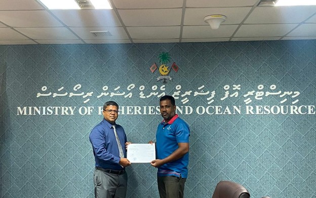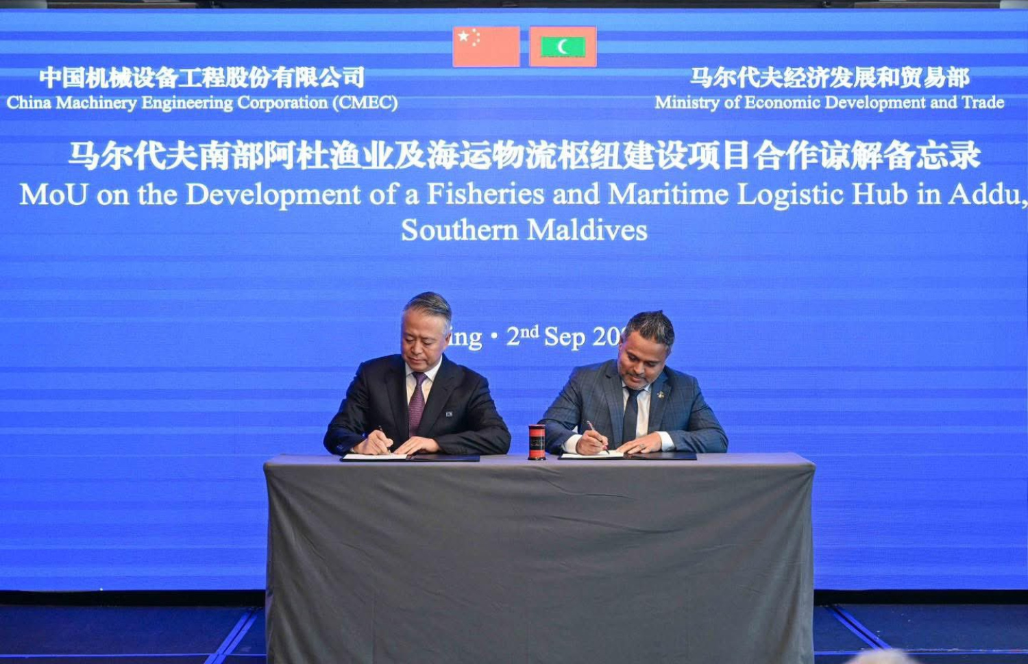 މަސްވެރިކަމާ ބެހޭ ވަޒީރު އަޙުމަދު ޝިޔާމް، ގއ. ކޫއްޑޫ ކޯލްޑް ސްޓޯރޭޖް އެކްސެޕްޝަން ޕްރޮޖެކްޓުގައި ސޮއިކުރުމުގެ ރަސްމިއްޔާތު، 7 ނޮވެންބަރު 2024