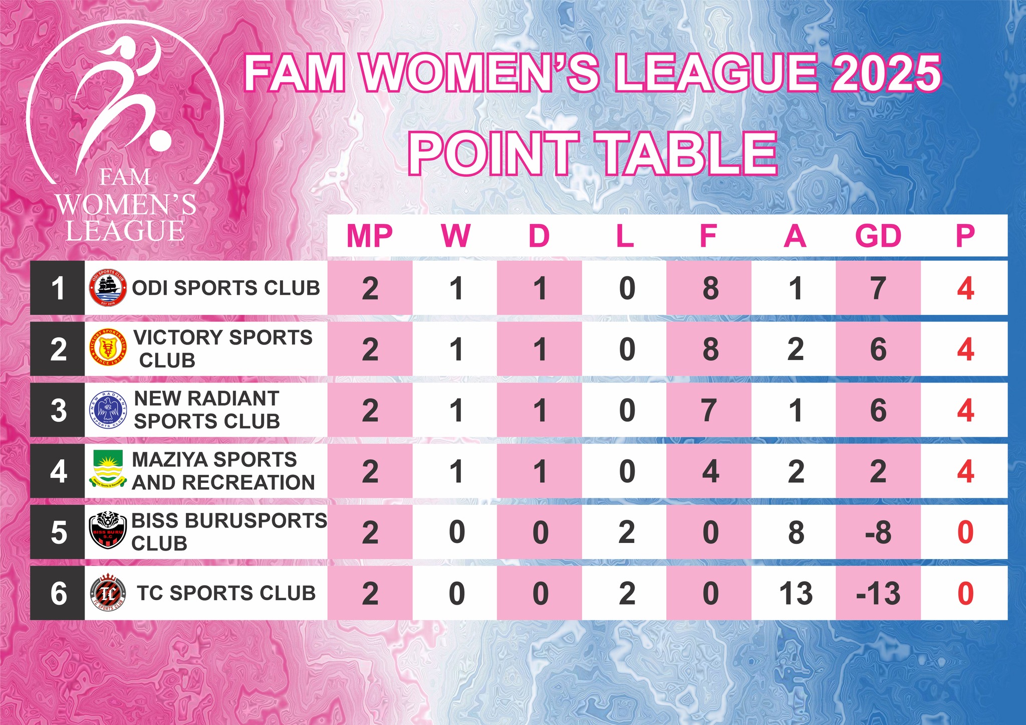 ކޮންމެ ޓީމެއް ވެސް މިހާތަނަށް ދެ މެޗު ކުޅެފައިވާއިރު ލީގުގެ އެއްވަނައިގައި މިހާރު އޮތީ 4 ޕޮއިންޓާއެކު އޮޑި ސްޕޯޓްސް ކްލަބެވެ. އަދި ދެވަނައިގައި އޮތް ވިކްޓަރީ ސްޕޯޓްސް ކްލަބަށް ވެސް 4 ޕޮއިންޓު ލިބިފައިވާއިރު، 4ވަނައިގައި އޮތް މާޒިޔާ ސްޕޯޓްސް އެންޑް ރެކްރިއޭޝަނަށް ވެސް ލިބިފައި ވަނީ 4 ޕޮއިންޓެވެ. އެހެންކަމުން ލީގުގެ މަތީގައި އޮތް 4 ޓީމު ތާވަލުގައި މިހާރު ރޭންކުކުރެވިފައި ވަނީ ގޯލު ތަފާތުންނެވެ.