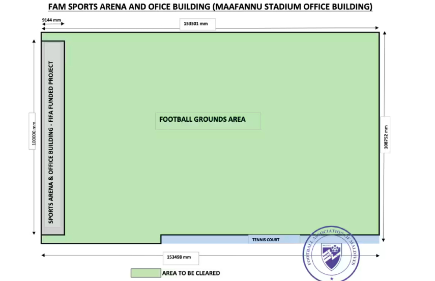 އެފްއޭއެމްއިން ނެރުނު ނޯޓިސްއެއްގައި ބުނީ، މާފަންނު ސްޓޭޑިއަމް ސަރަހައްދު 387 ނަންބަރު ކޮށީގައި ހަދަމުން އައި ސްޕޯޓްސް އެރީނާ އާއި އޮފީސް އިމާރާތާ އިންވެންގެން އިރުމައްޗަށް އޮތް ބިމުގައި ފުޓްބޯޅަ ބޮޑު ދެ ދަނޑު އެޅުމަށް ނިންމާފައިވާ ކަމަށެވެ.