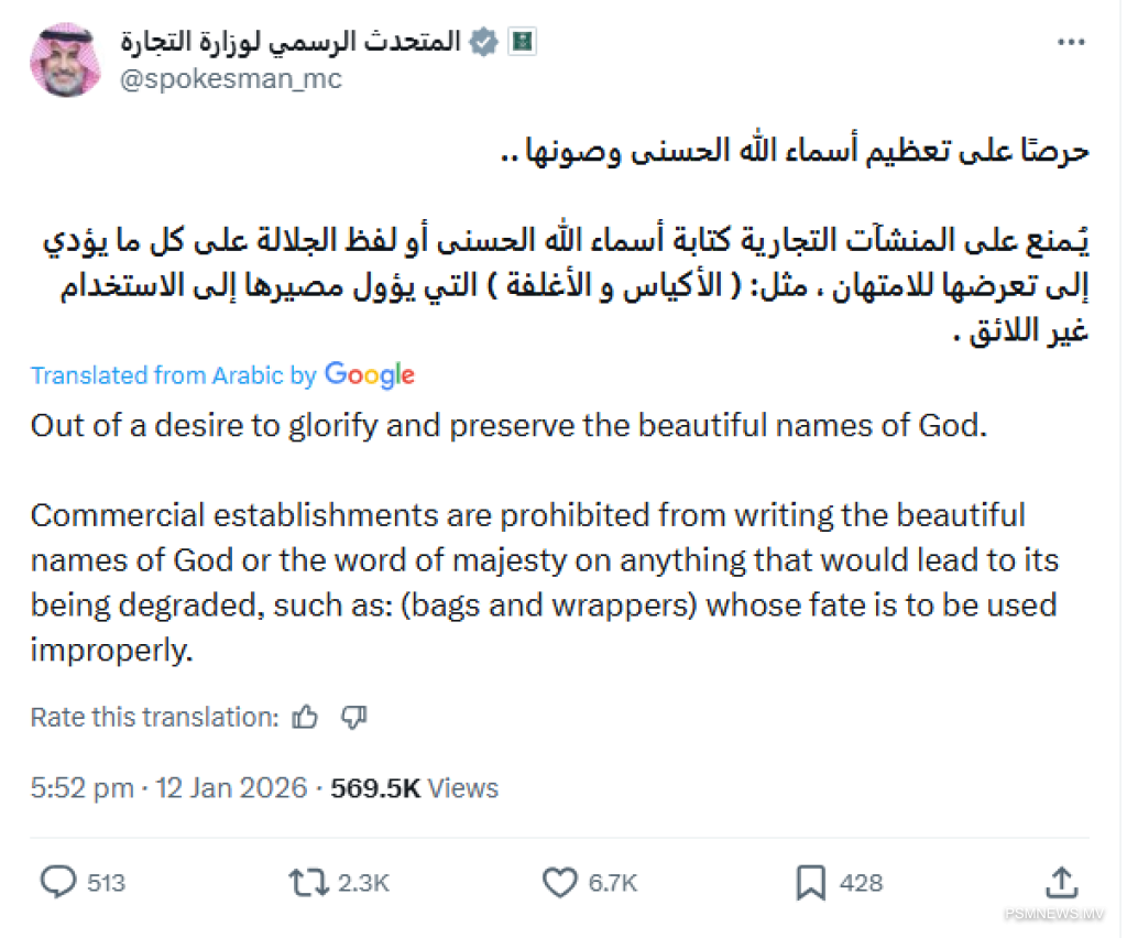 މި ނިންމުމާއެކު، ސަޢުދީގައި ހިންގާ އެކި ވިޔަފާރިތަކުން އެ މީހުންގެ މުދާ އިޝްތިހާރު ކުރުމަށާއި ބަންދުކުރުމަށް ބޭނުންކުރާ އެއްވެސް އެއްޗެއްގައި މާތްﷲގެ އިސްމުފުޅު ބޭނުންކުރުން މިހާރު ވަނީ މަނާވެފައެވެ.