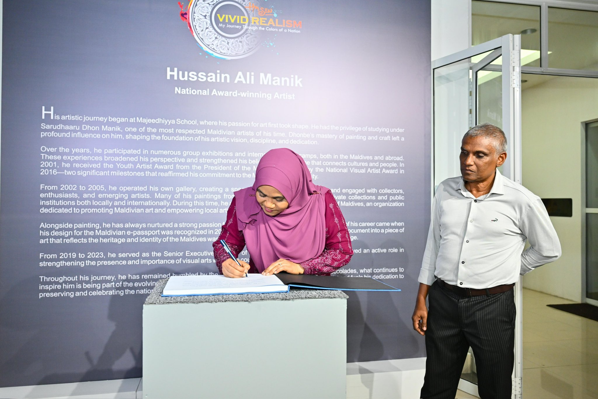"ވިވިޑް ރިއަލިޒަމް – ބައި ޙުސައިން" ގެ ނަމުގައި ކުރިއަށްގެންދާ މި މަޢުރަޒަކީ ކުރެހުންތެރިޔާ ޙުސައިން އަލީ މަނިކުގެ ފިހިން ދިވެހި ދިރިއުޅުމުގެ އާދަކާދައާއި މަސައްކަތްތެރިކަން ސިފަކޮށްދޭ މަންޒަރުތައް ހިމެނޭ މަޢުރަޒެކެވެ. މި މަޢުރަޒު ހުޅުވުމަށް ބޭއްވި ރަސްމިއްޔާތުގައި ރައީސުލްޖުމްހޫރިއްޔާގެ އަނބިކަނބަލުން ވަނީ "ވިވިޑް ރިއަލިޒަމް – މައި ޖަރނީ ތްރޫ ދަ ކަލަރސް އޮފް އަ ނޭޝަން" ފޮތް ނެރެދެއްވާފައެވެ.