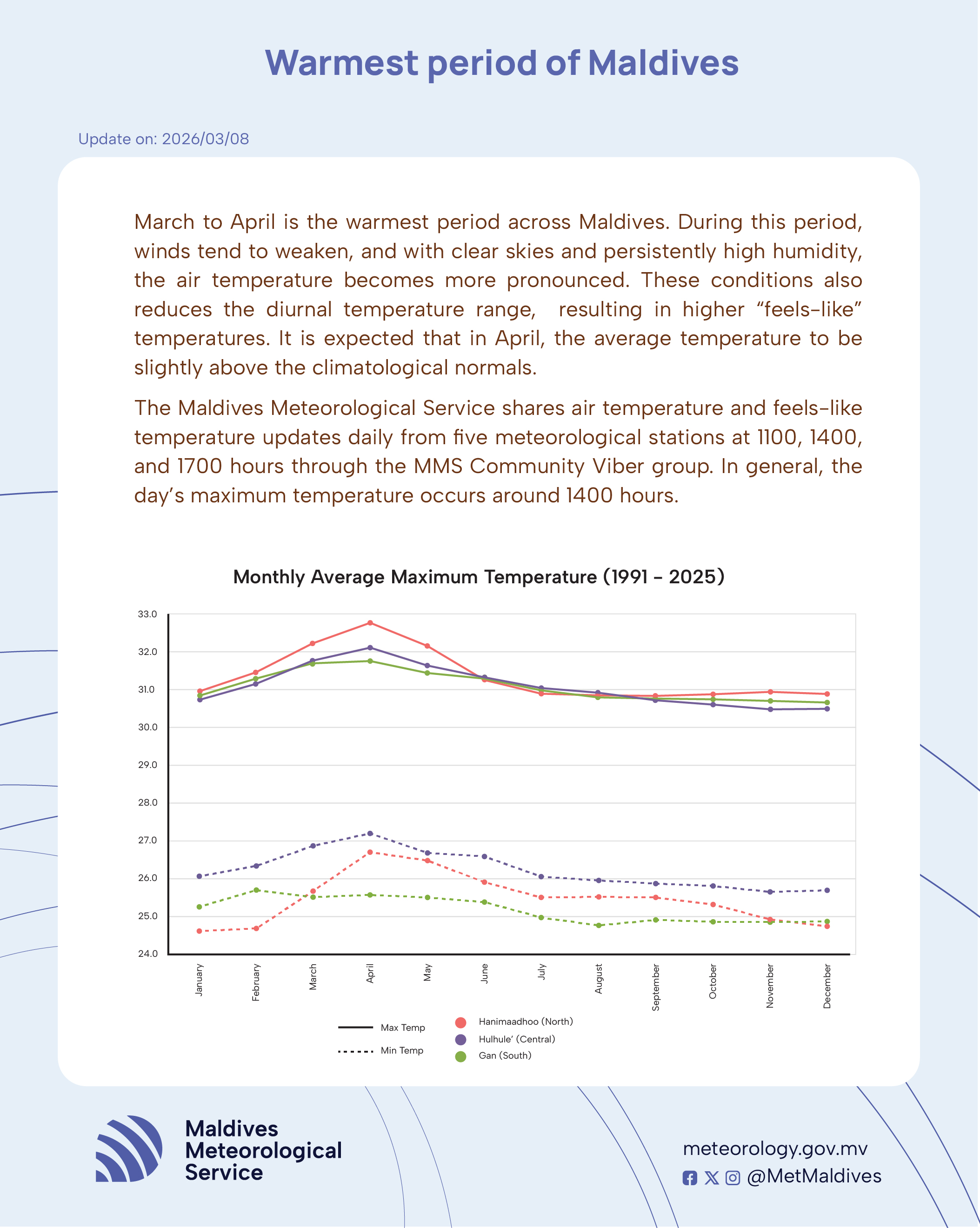މެޓް އޮފީހުން ވިދާޅުވީ، ކޮންމެ އަހަރެއްގެ ވެސް މާރިޗް އަދި އޭޕްރީލް މަހަކީ އަހަރުގެ ތެރޭގައި ރާއްޖޭގެ ސަރަޙައްދަށް ހޫނުމިން އެންމެ މައްޗަށްދާ ދުވަސްވަރު ކަމަށެވެ.
