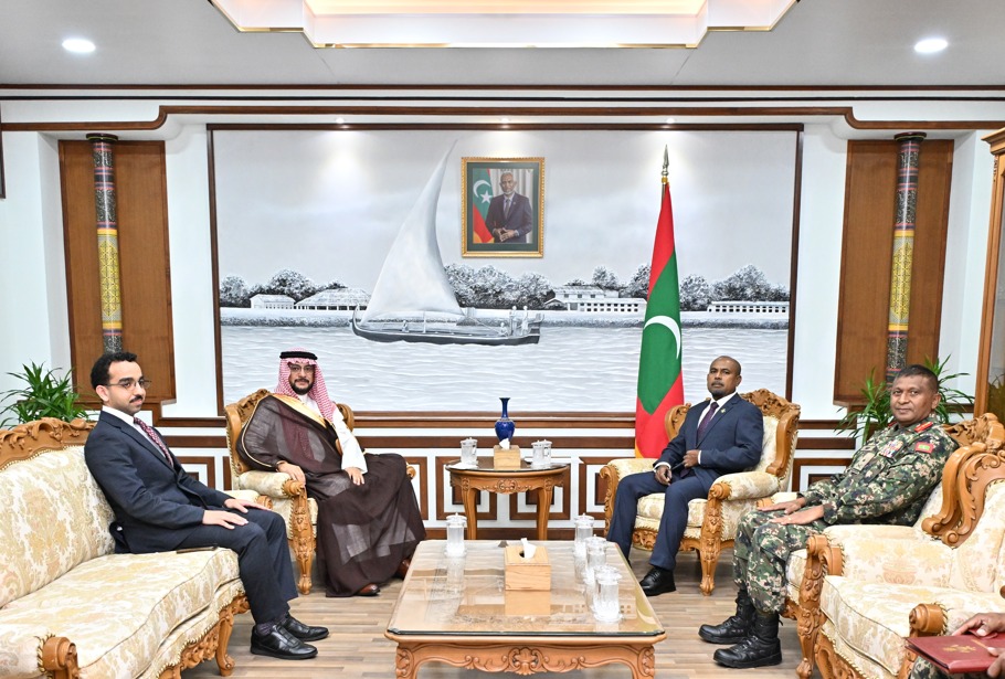 ސަޢުދީ ޢަރަބިއްޔާއިން ދިވެހިރާއްޖެއަށް ކަނޑައަޅުއްވާފައި ހުންނަވާ ސަފީރާއި ރާއްޖޭގެ ދިފާއީ ވަޒީރު ބައްދަލުކުރެއްވުން / ފޮޓޯ: ދިފާއީ ވުޒާރާ