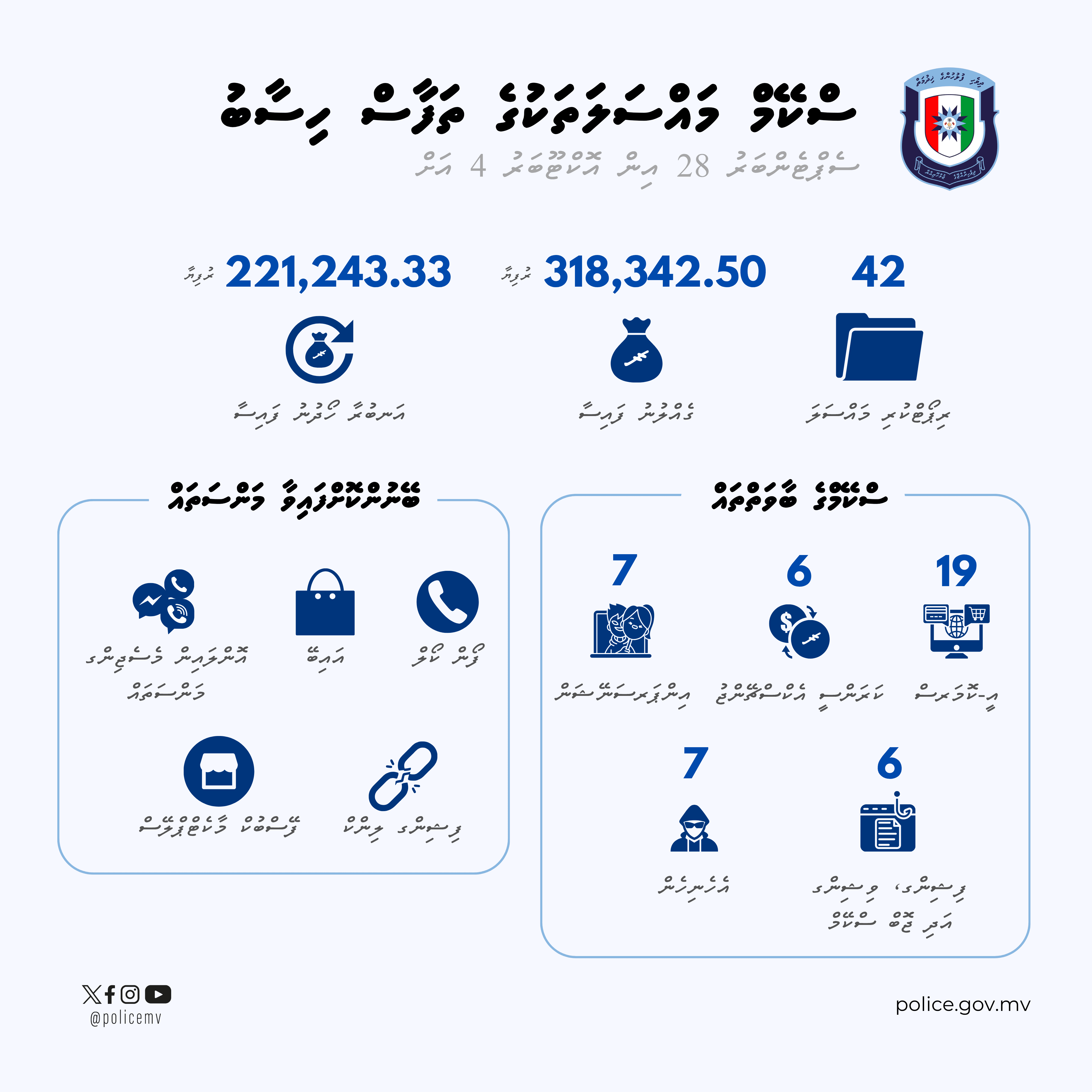 ފުލުހުންގެ އެންޓި ސްކޭމް ސެންޓަރުގެ ތަފާސް ހިސާބުތަކަށް ބަލާއިރު، ނިމިދިޔަ ސެޕްޓެމްބަރު މަހުގެ 28 ވަނަ ދުވަހުން ފެށިގެން މިހިނގާ އޮކްޓޫބަރު މަހުގެ 4 ވަނަ ދުވަހުގެ ނިޔަލަށް ސްކޭމްގެ 42 މައްސަލައެއް އެ ސެންޓަރަށް ވަނީ ހުށަހަޅާފައެވެ. އަދި މި މައްސަލަތަކުގައި ޖުމްލަ 318،342.50 ރުފިޔާ ގެއްލިފައިވާއިރު، މިފައިސާގެ ތެރެއިން ޖުމްލަ 221،243.33 ރުފިޔާ އަނބުރާ ހޯދާފައިވާކަމަށް ފުލުހުން ވަނީ ވިދާޅުވެފައެވެ.